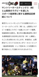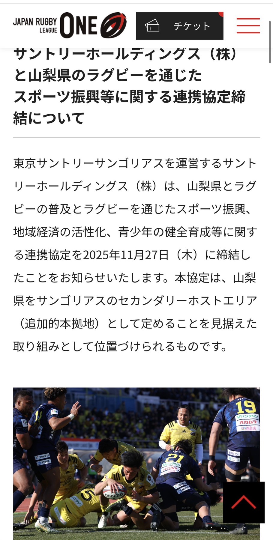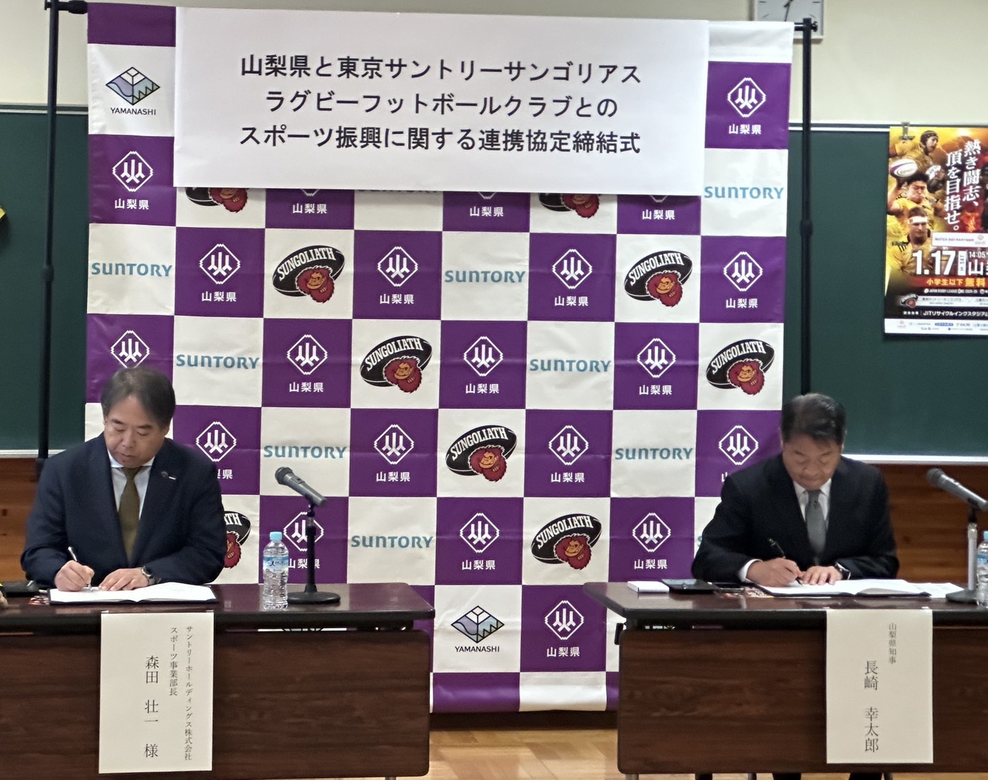その他 スポーツ振興に関する連携協定締結式 2025.12.1 その他 山梨県と東京サントリーサンゴリアスラグビーフットボールクラブとの スポーツ振興に関する連携協定締結式が行われ、 サントリーホールディングス(株) 森田壮一 スポーツ事業部長 山梨県 長崎幸太郎知事が協定書に署名をしました。 スポくる!前の記事 【山梨開催】ジャパンラグビーリーグワン2025-202…次の記事
